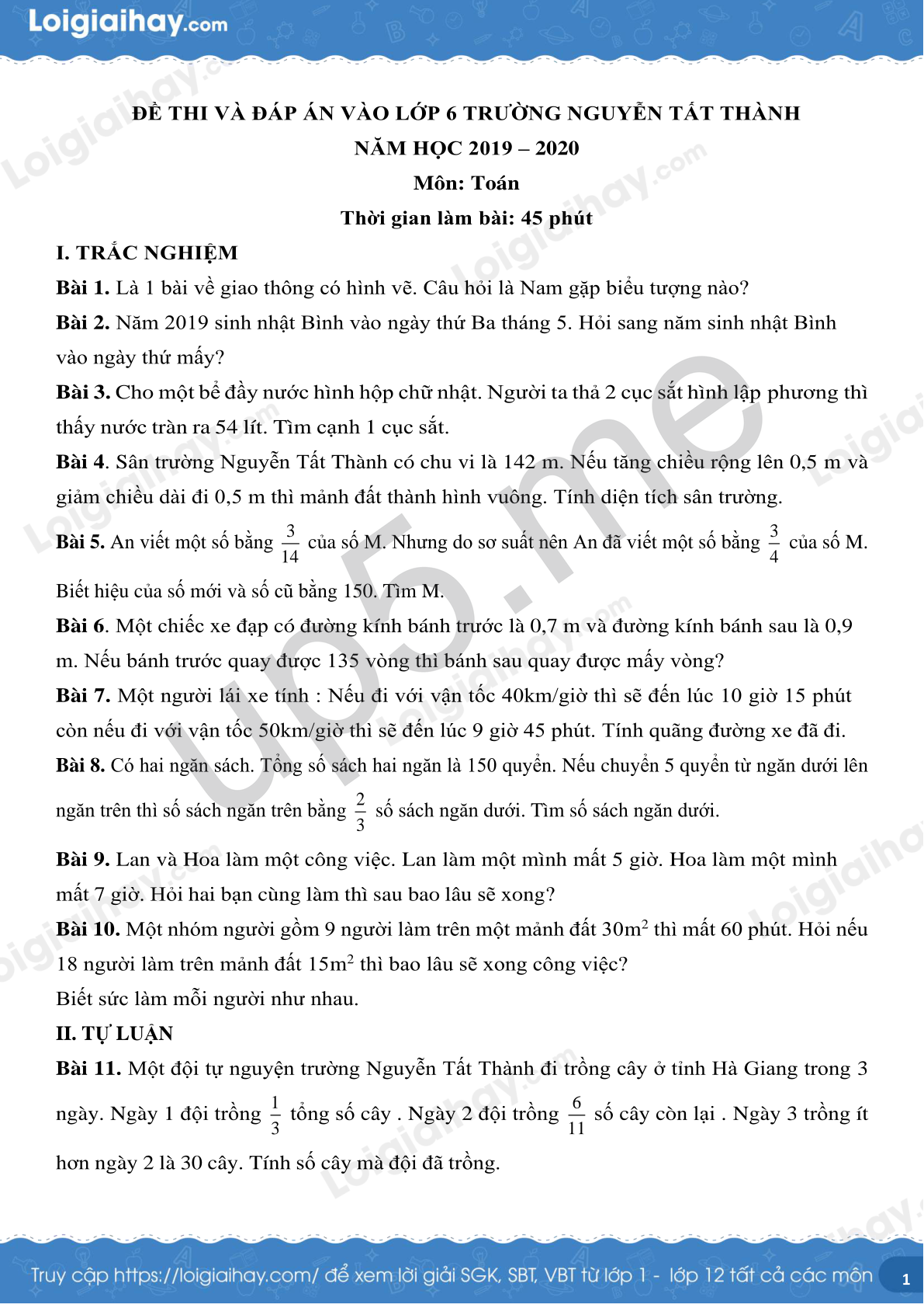 ĐỀ THI VÀ ĐÁP ÁN VÀO LỚP 6 TRƯỜNG NGUYỄN TẤT THÀNH
