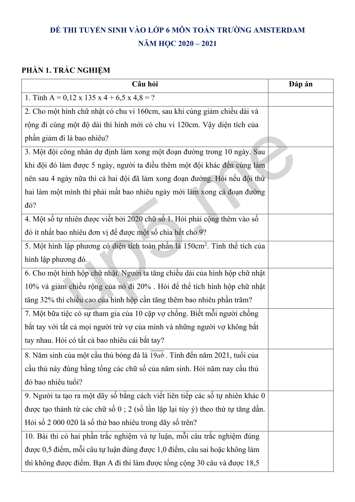 ĐỀ THI TUYỂN SINH VÀO LỚP 6 MÔN TOÁN TRƯỜNG AMSTERDAM