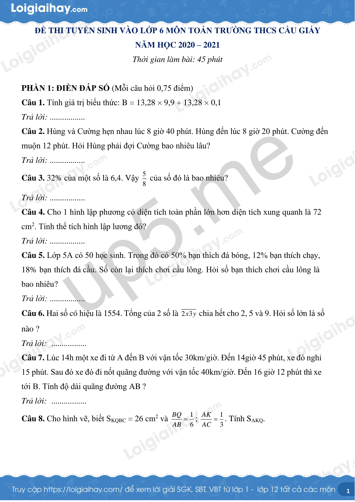 ĐỀ THI TUYỂN SINH VÀO LỚP 6 MÔN TOÁN TRƯỜNG THCS CẦU GIẤY