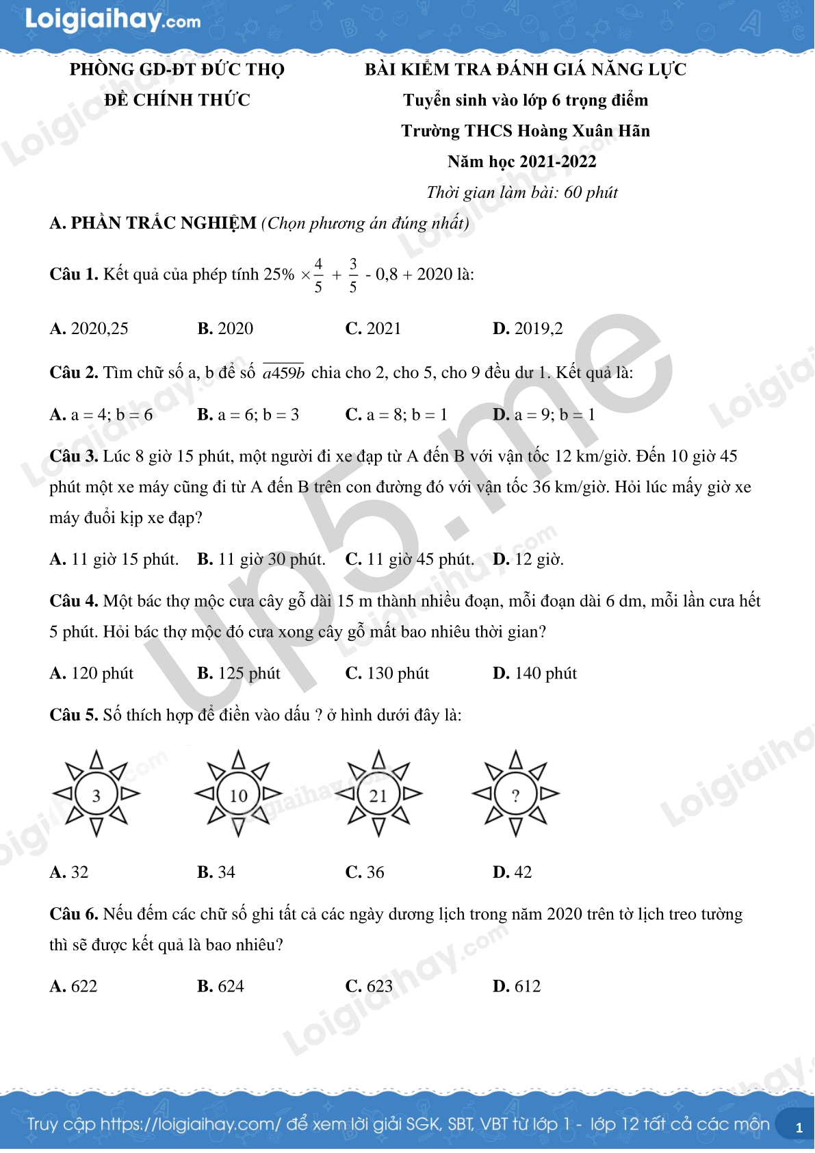 | PHÒNG GD-ĐT ĐỨC THỌĐỀ CHÍNH THỨC | BÀI KIỂM TRA ĐÁNH GIÁ NĂNG LỰCTuyển sinh vào lớp 6 trọng điểmTrường THCS Hoàng Xuân HãnNăm học 2021-2022Thời gian làm bài: 60 phút |