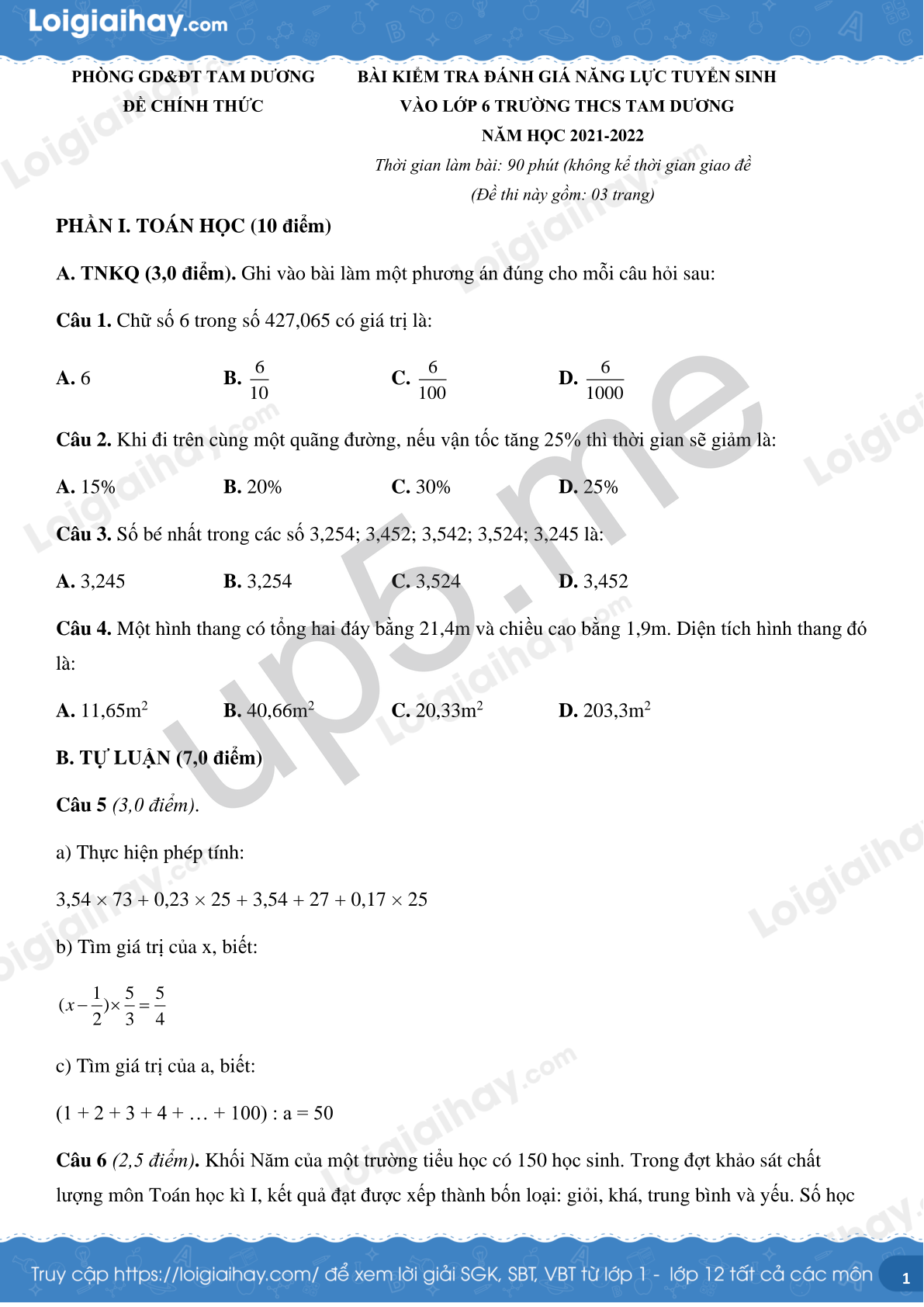 | PHÒNG GD&ĐT TAM DƯƠNGĐỀ CHÍNH THỨC | BÀI KIỂM TRA ĐÁNH GIÁ NĂNG LỰC TUYỂN SINHVÀO LỚP 6 TRƯỜNG THCS TAM DƯƠNGNĂM HỌC 2021-2022Thời gian làm bài: 90 phút (không kể thời gian giao đề(Đề thi này gồm: 03 trang) |