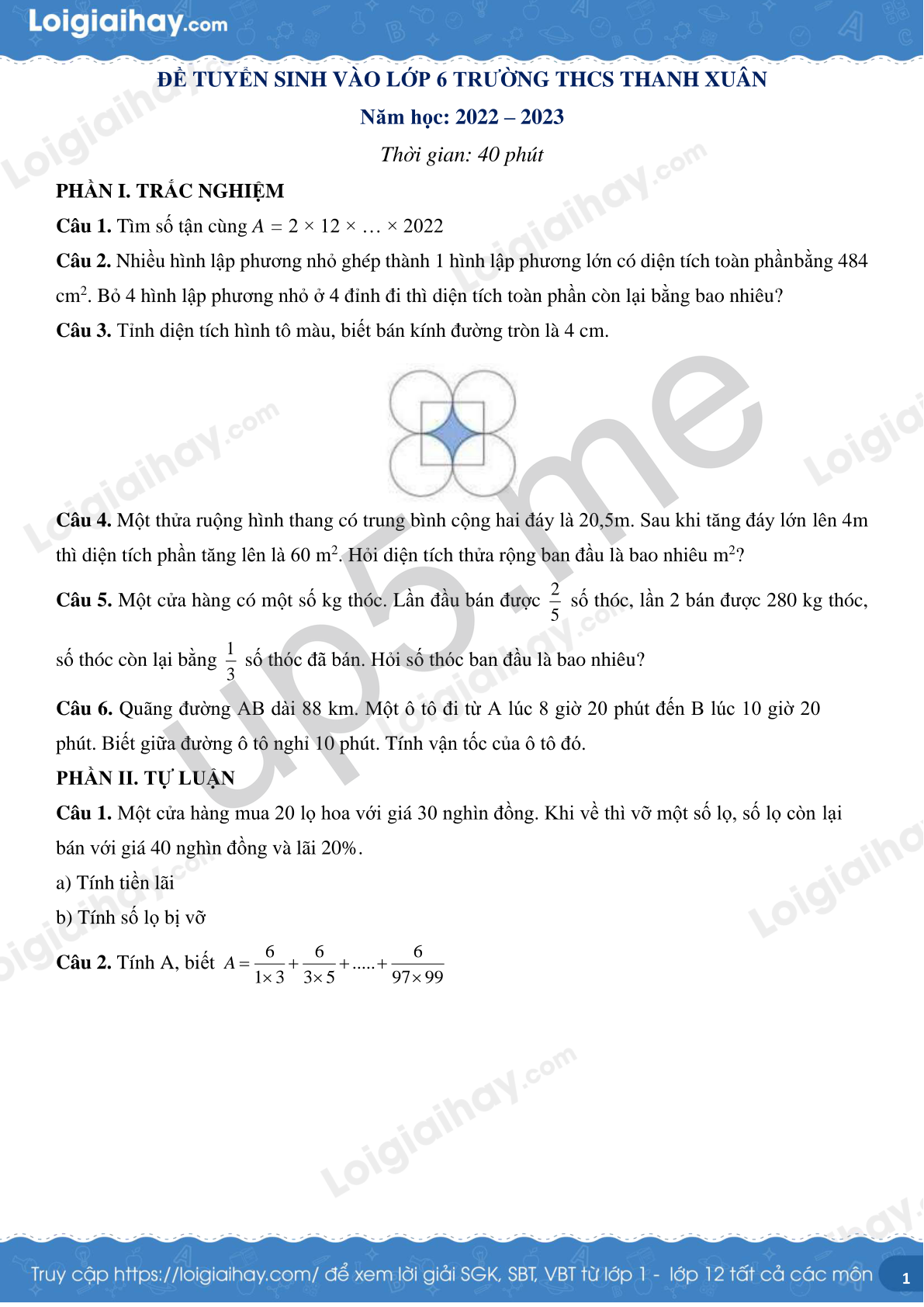 ĐỀ TUYỂN SINH VÀO LỚP 6 TRƯỜNG THCS THANH XUÂN