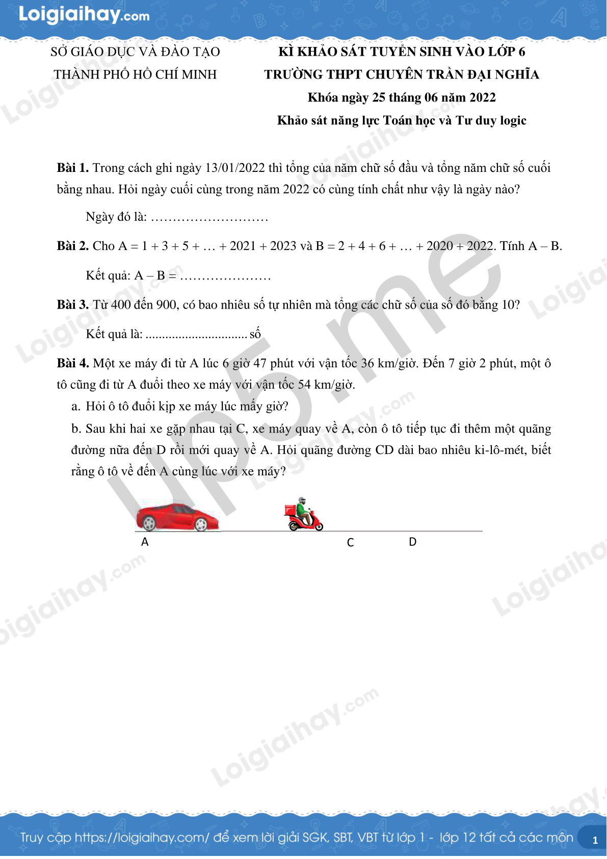 | SỞ GIÁO DỤC VÀ ĐÀO TẠO THÀNH PHỐ HỒ CHÍ MINH | KÌ KHẢO SÁT TUYỂN SINH VÀO LỚP 6TRƯỜNG THPT CHUYÊN TRẦN ĐẠI NGHĨAKhóa ngày 25 tháng 06 năm 2022Khảo sát năng lực Toán học và Tư duy logic |