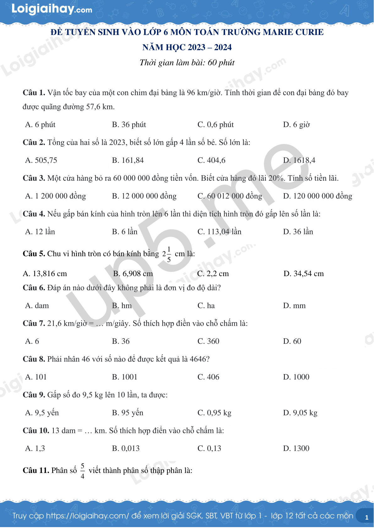 ĐỀ TUYỂN SINH VÀO LỚP 6 MÔN TOÁN TRƯỜNG MARIE CURIE