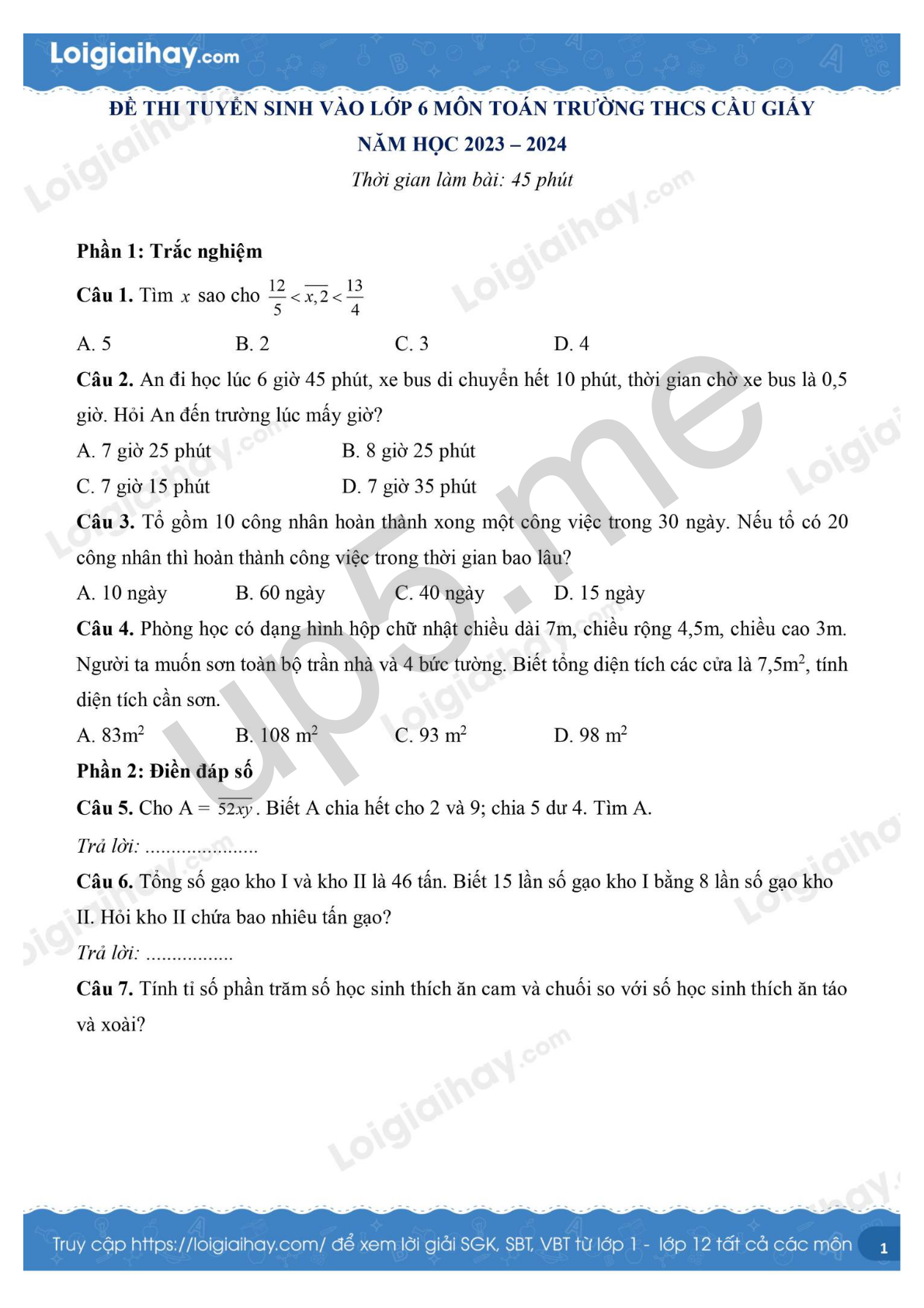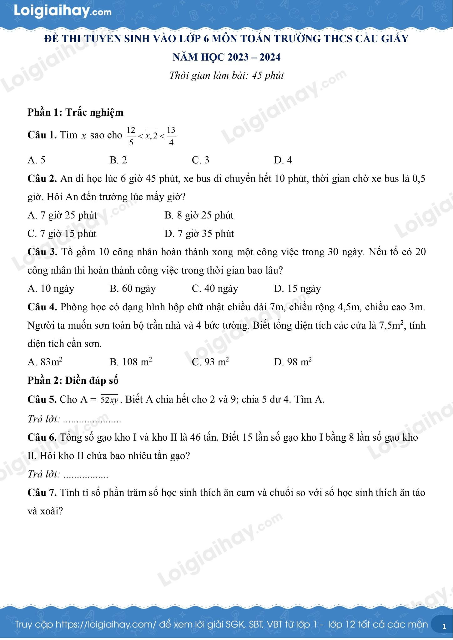 Đề thi vào lớp 6 môn Toán năm 2023 - 2024 trường THCS Cầu Giấy