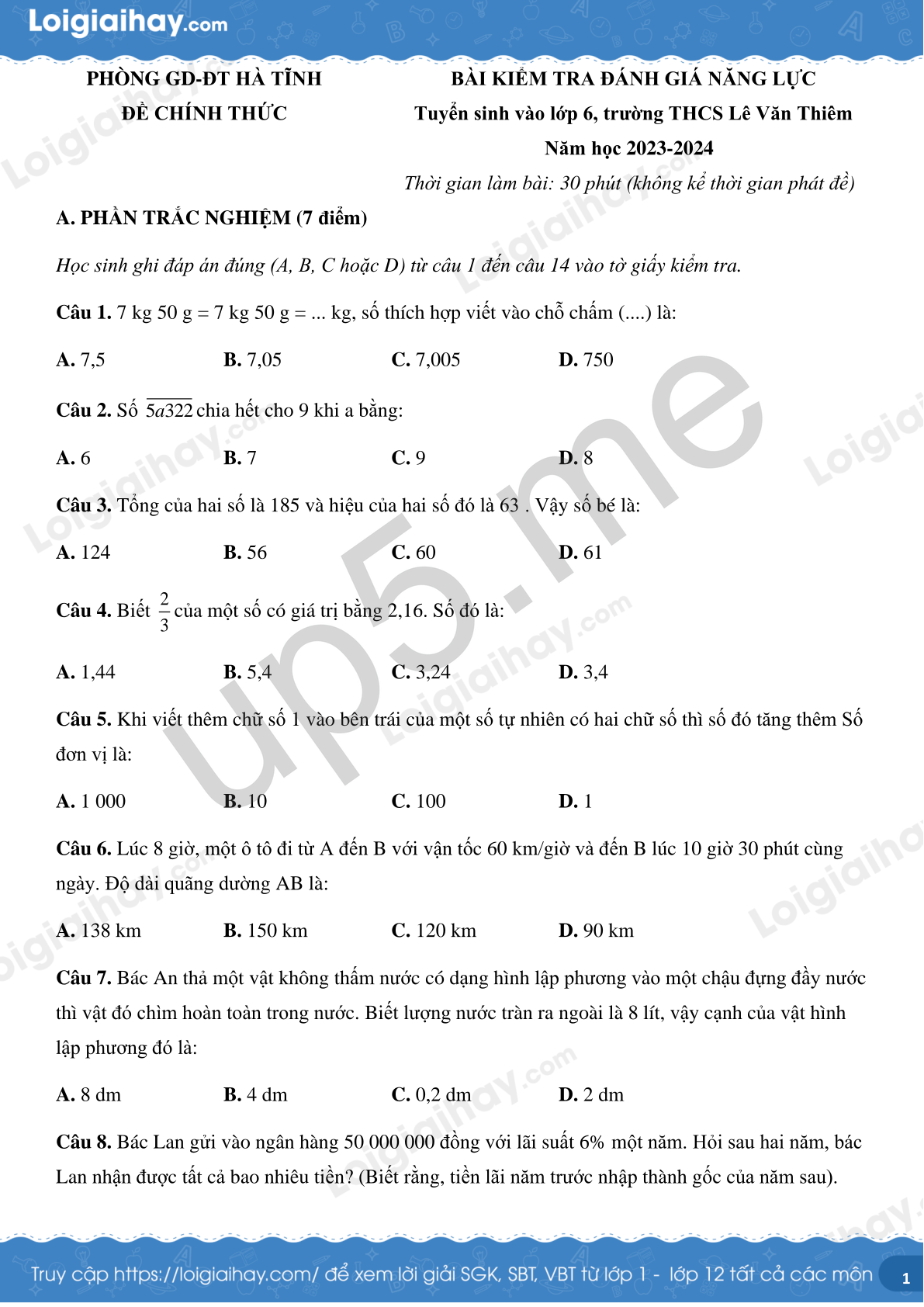 | PHÒNG GD-ĐT HÀ TĨNHĐỀ CHÍNH THỨC | BÀI KIỂM TRA ĐÁNH GIÁ NĂNG LỰCTuyển sinh vào lớp 6, trường THCS Lê Văn ThiêmNăm học 2023-2024Thời gian làm bài: 30 phút (không kể thời gian phát đề) |