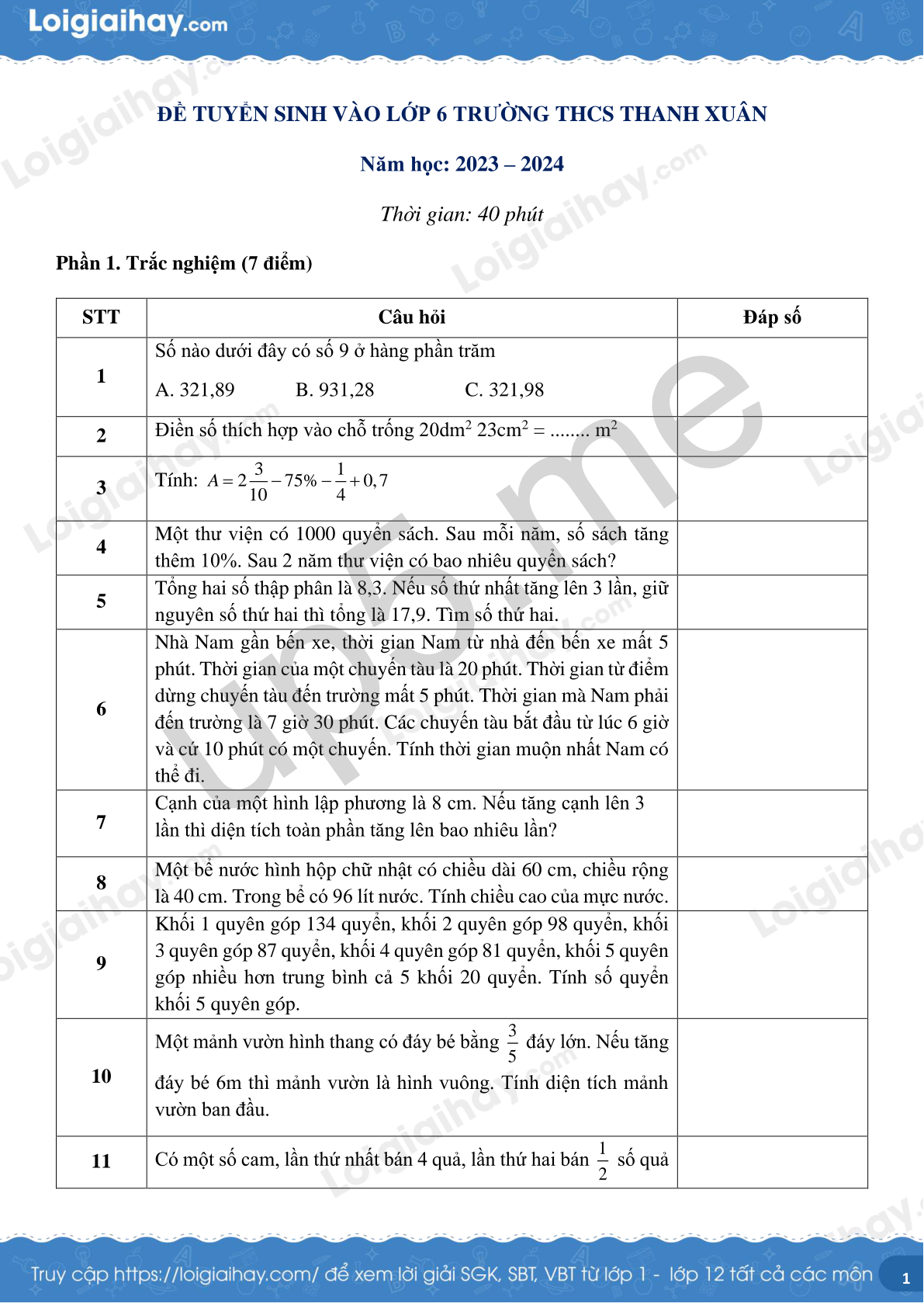 ĐỀ TUYỂN SINH VÀO LỚP 6 TRƯỜNG THCS THANH XUÂN