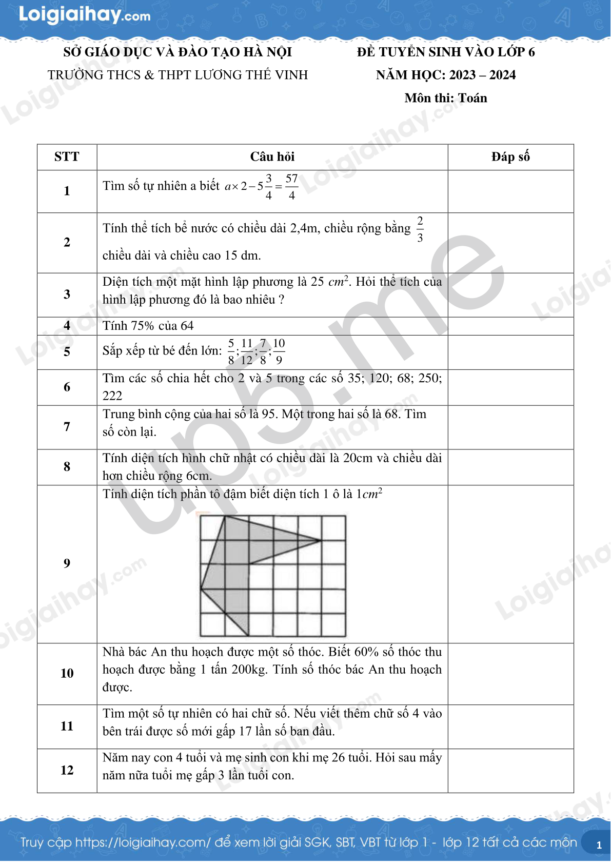 Đề thi vào lớp 6 môn Toán năm 2023 - 2024 trường THCS & THPT Lương Thế Vinh