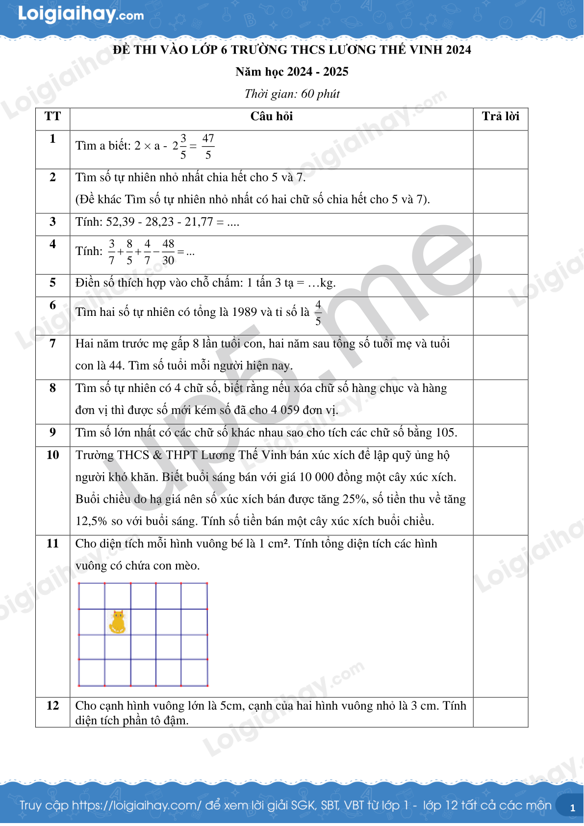 ĐỀ THI VÀO LỚP 6 TRƯỜNG THCS LƯƠNG THẾ VINH 2024