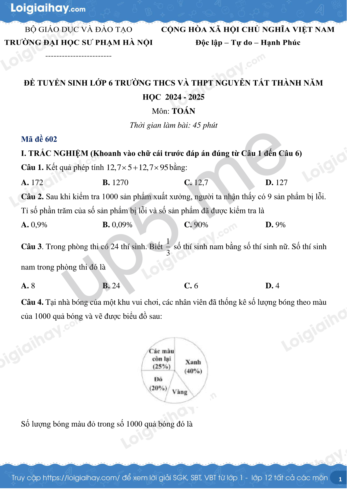 ĐỀ TUYỂN SINH LỚP 6 TRƯỜNG THCS VÀ THPT NGUYỄN TẤT THÀNH NĂM HỌC 2024 - 2025