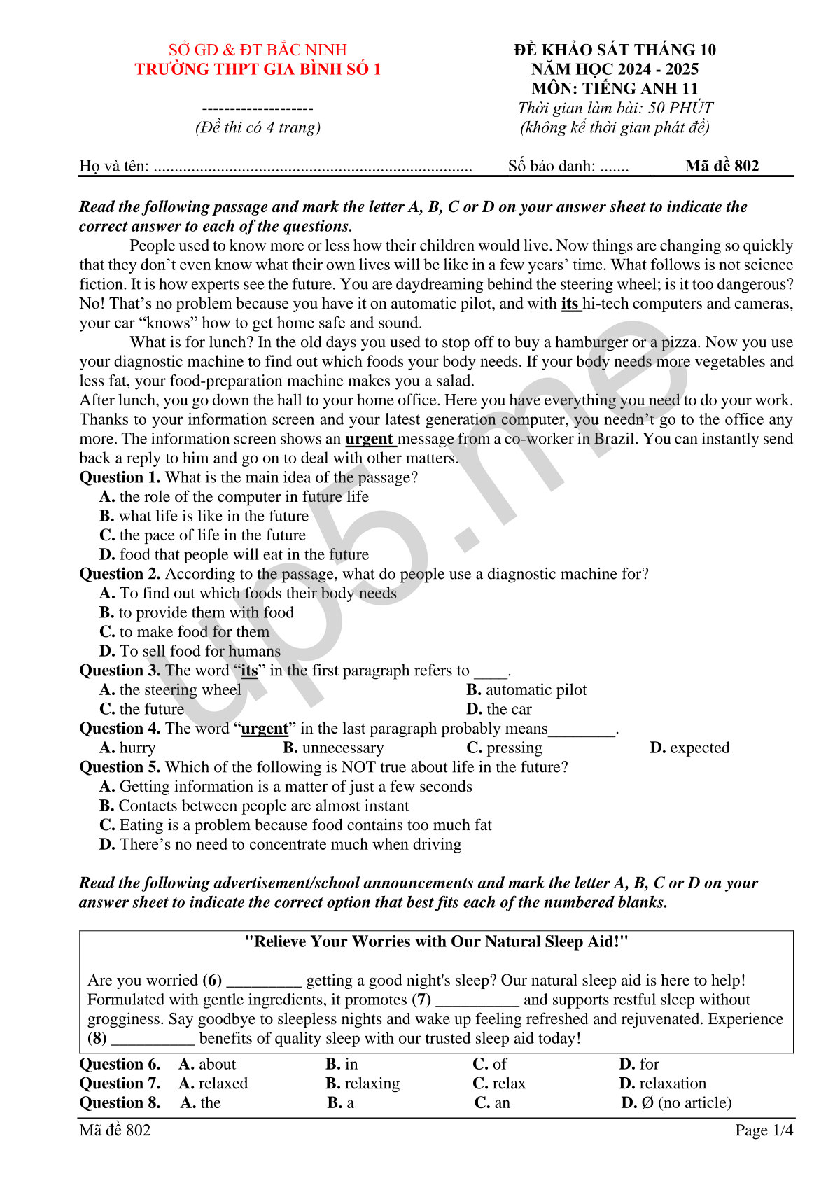 | Họ và tên: ............................................................................ | Số báo danh: ....... | Mã đề 802 |